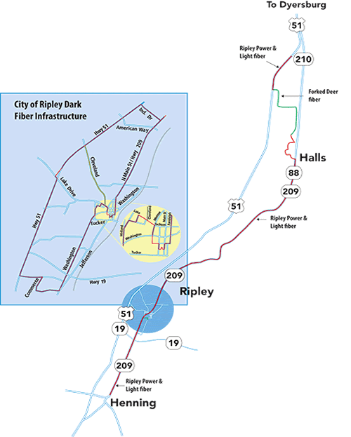 Power and Light first installed a dark fiber loop around Ripley and up Highway 209 to Halls. It recently has expanded its infrastructure north of Halls to Dyersburg and south of Ripley to outside Henning. Its fiber now connects to high-speed fiber installed by other electric utilities and to a nationwide high-speed fiber network.