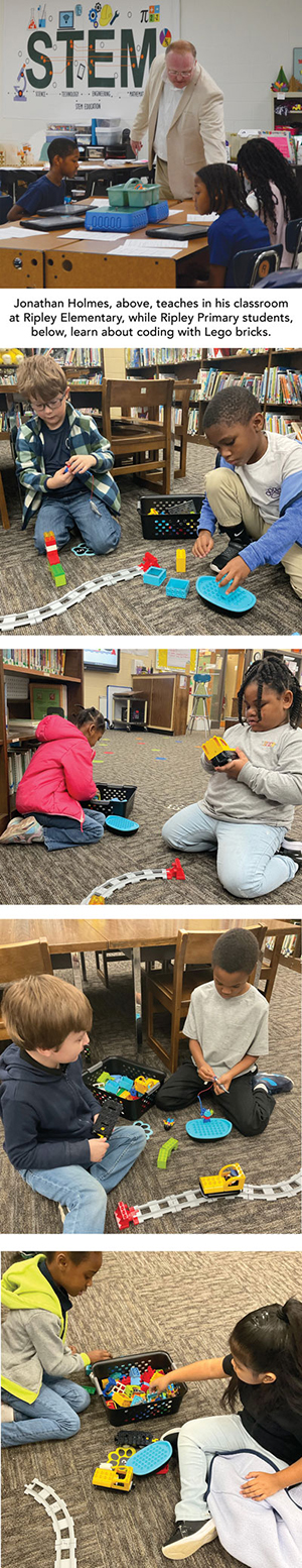 Small hands are building trains and tracks with Lego bricks in Lesley Olds’ classroom at Ripley Primary School. As they build, the kindergarten through second grade students are learning the beginning concepts of computer coding, said Olds, the school’s media specialist.